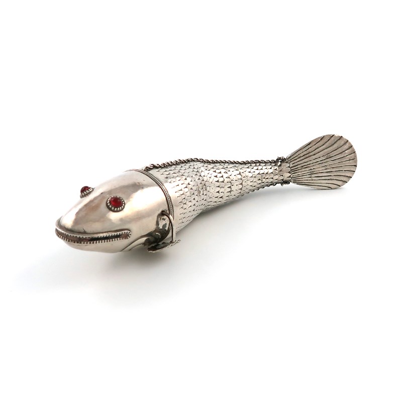 the head set with red eyes, fluted tail, one fin missing, length 23cm.