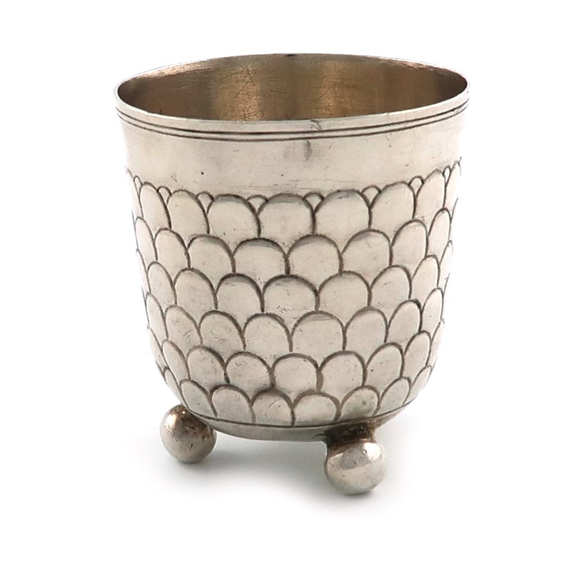 tapering circular form, with fish-scale decoration, on three ball feet, height 6.7cm, approx. weight 2.4oz.