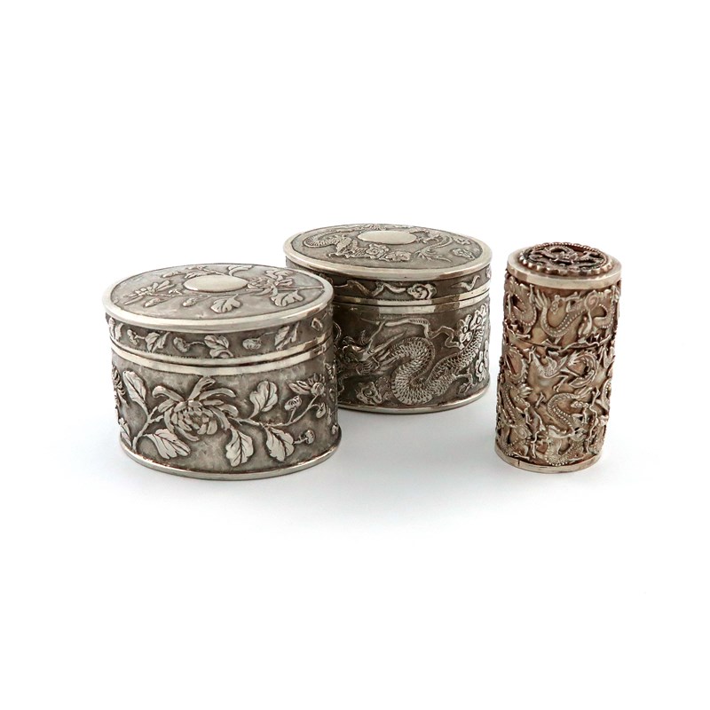 oval form, one decorated with dragons, the other with foliate decoration, on a matted background, gilded interiors, length 7.8cm, plus a metalware box of cylindrical form, applied dragon decoration, height 6.8cm. (3)