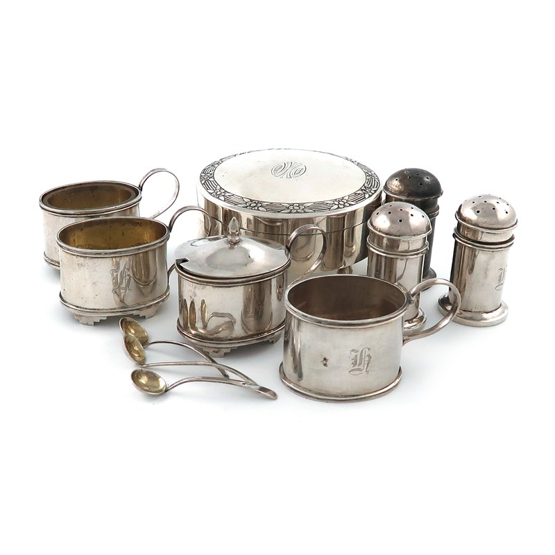 comprising: a dressing table box, by Wang Hing, circular form, the hinged cover with a foliate and reed border and initialled, on three hoof feet, diameter 9cm, plus a seven-piece condiment set, of oval and circular form, comprising: a mustard pot, (hinge a.f), three salt cellars, with a scroll handle, and three pepper pots, with three condiment spoons and three glass liners, (one a.f), approx. weight 14oz. (qty)
