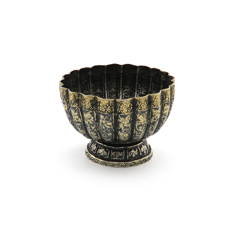 fluted circular form, with foliate niello work decoration, on a circular base, filled, diameter 7.2cm.
