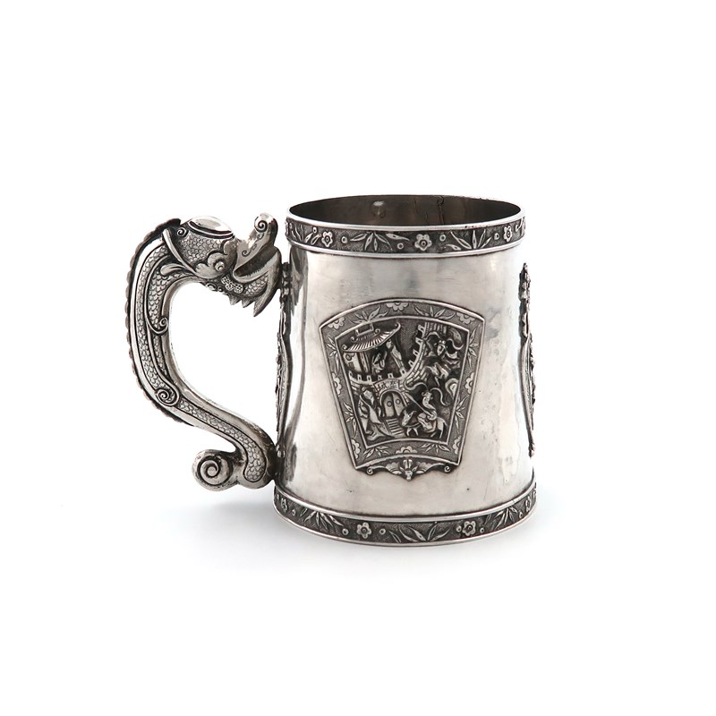 tapering circular form, the scroll handle formed as a dragon, the body with applied panels of figures in landscape settings and with a vase, height 8.8cm, approx. weight 6.8oz.
