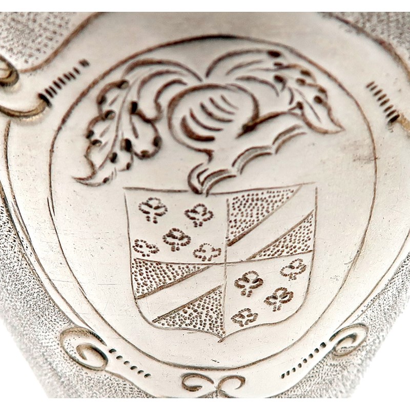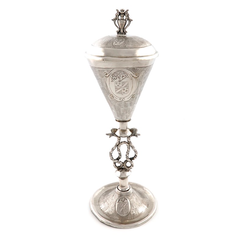matted decoration, tapering circular bowl embossed with an armorial, the stem with two mythical beast heads with snake like bodies, the cover with a scroll-mounted urn finial and an armorial, on a raised circular foot with an armorial, height 36cm, approx. weight 14.9oz. (2)