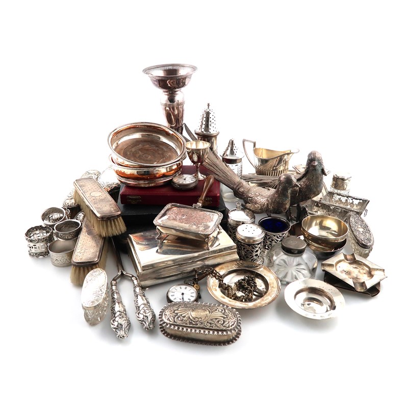 comprising silver items: a rectangular waiter, by The Adie Brothers, Birmingham 1927, a three-piece modern condiment set, by W I Broadway & Co. London 2000, a plain bowl, London 1963, six ashtrays, six napkin rings, a scent bottle, two toilet jars, a dressing table box, a modern Spanish box, two continental rectangular dishes, a pair of curling tongs, a cased set of tea knives, two part sets of spoons, a pocket watch and chain, and various brushes, plus electroplated items including: a pair of pheasants, a vase, a pair of coasters and other items, approx. weighable 34oz. (qty)