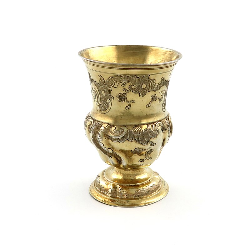 tapering and baluster form, chased foliate scroll decoration, on a raised circular foot with foliate scroll decoration, height 11.5cm, approx. weight 5.7oz.