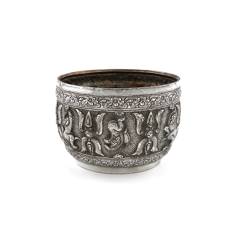 circular form, embossed with figures and foliate decoration, diameter 15.5cm, height 10.8cm.