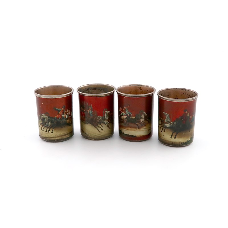 tapering circular form, each painted with a scene of a troika on a dark red ground, height 5.6cm and 5.4cm, approx. weight 6oz. (4)