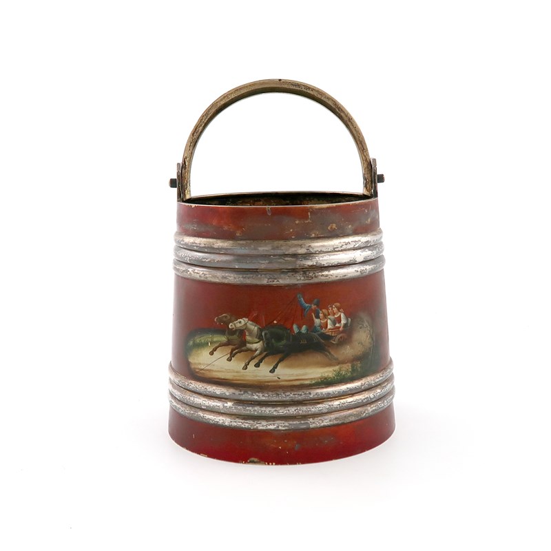 tapering circular barrel form, swing handle, painted with a scene of a troika on a dark red ground, height 21cm, approx. weight 19.4oz.