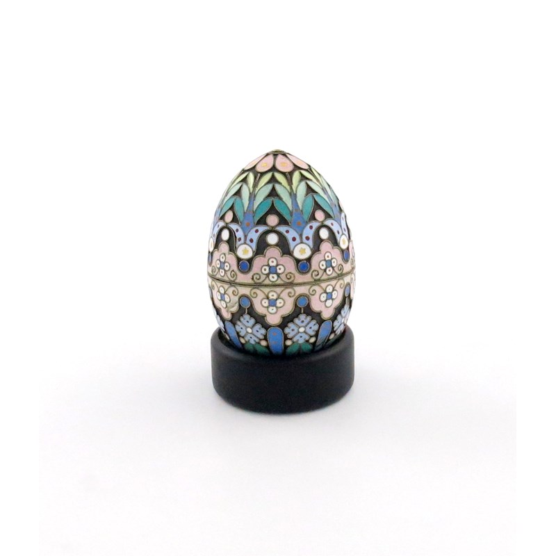 with pink and blue/green decoration on a matted background, wire-work borders, pull-off cover, the interior silver-gilt, length 6cm, approx. weight 2oz.