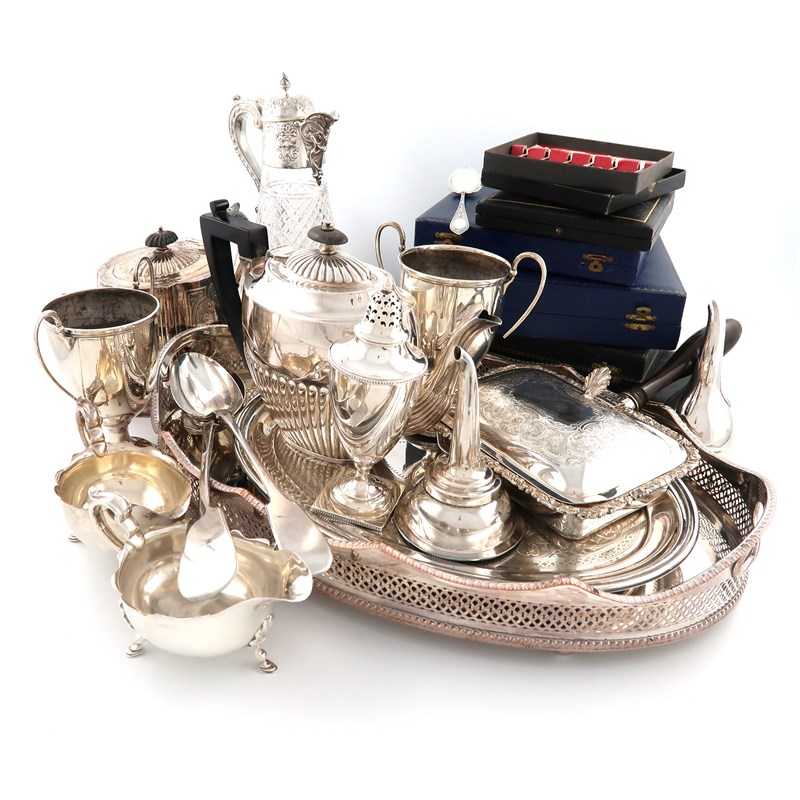 comprising silver items: a silver-mounted claret jug, Sheffield 1900, scroll handle, embossed decoration, the hinge a.f, plus a pair of sauce boats, by A and F Parsons, London 1925, oval form, scroll handle, wavy-edge border, on three hoof feet, two trophy cups, an American caster, a jam spoon, six coffee spoons, plus electroplated items a gallery tray, two teapots, a covered dish, an oval salver, two wine funnels, twelve fish knives and forks and a pair of fish servers with ivorine plastic handles, two basting spoons and other items, approx. weighable 30oz. (qty)