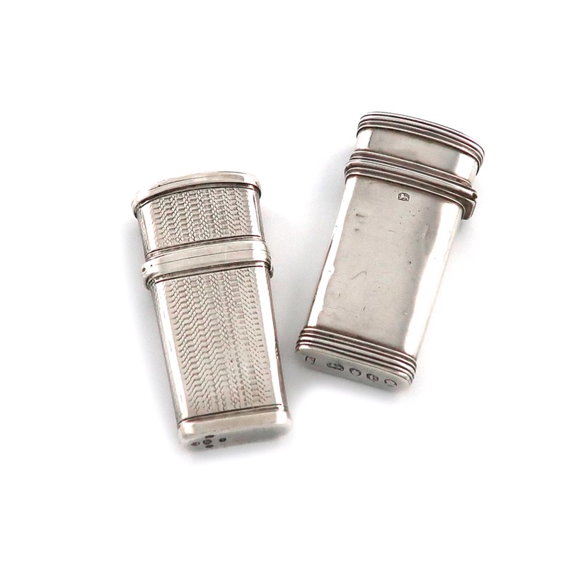 tapering plain rectangular form, the interior with four lancet spaces and two tortoiseshell lancets, one blade stamped 'Willan', length 6.4cm, plus a George IV silver lancet case, by Joseph Taylor, Birmingham 1823, tapering rectangular form, engine-turned decoration, the interior with four tortoiseshell lancets, the blades stamped 'Wright, Dundee', and 'Young, Edinburgh', approx. total weight 1.8oz. (2)
