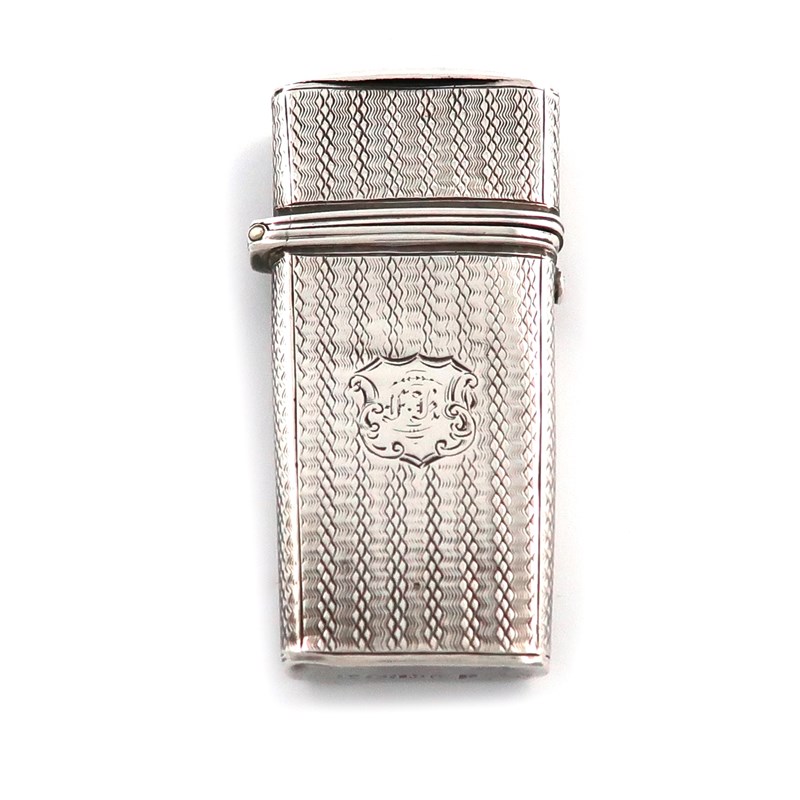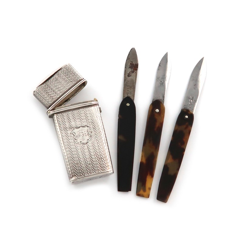 tapering rectangular form, engine-turned decoration, initialled 'F.K', the interior with three tortoiseshell lancets, the blades stamped 'Weiss' and 'Read', length 6cm, approx. weight 0.7oz.