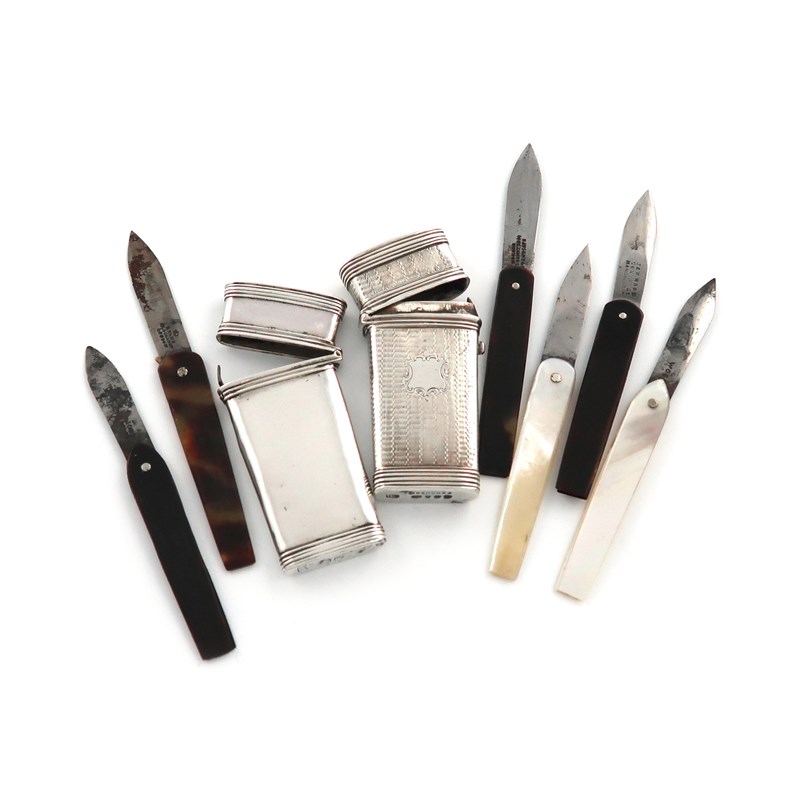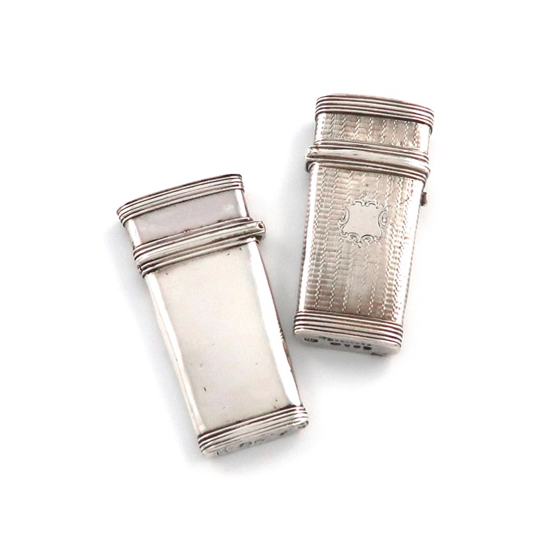 tapering plain rectangular form, the interior with two tortoiseshell lancets, one blade stamped 'Evans' and Wright', length 6.3cm, plus a Victorian silver lancet case, by H.C, London 1849, retailed by Ferguson, tapering rectangular form, engine-turned decoration, the interior with two tortoiseshell lancets, and two mother-of-pearl lancets, the blades stamped 'C and W Wood', and ''Savigny', length 6.1cm, approx. total weight 1.7oz. (2)