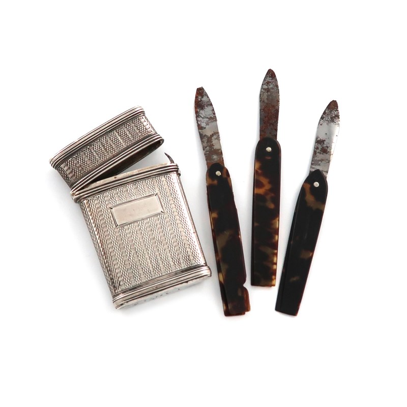 tapering rectangular form, engine-turned decoration, with a vacant cartouche, the interior with three tortoiseshell lancets, two blades stamped 'W.Smith', length 6.2cm.