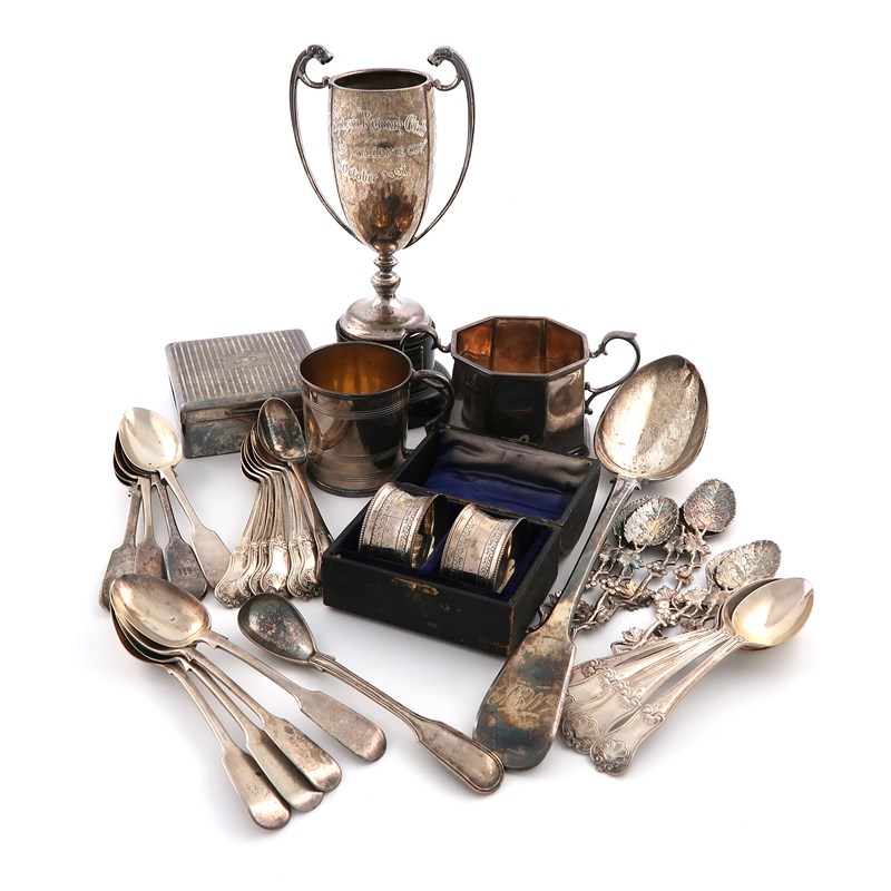 comprising: a small George III mug, by John Emes, London 1799, a set of six 18th century cast leaf teaspoons, unmarked, probably 18th century, a Fiddle pattern basting spoon, nine Fiddle teaspoons, a matched set of twelve teaspoons, a two-handled bowl, a cigarette case, a pair of napkin rings, a trophy cup and a mustard spoon, approx. weighable 39oz. (qty)