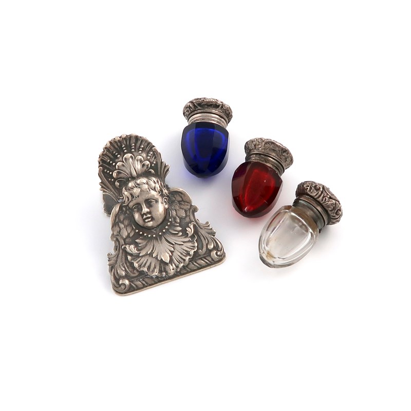 with clear, red and blue faceted glass bodies, the hinged covers with foliate mounts, plus an American silver letter clip, by Gorham, decorated with a cherub head and foliate decoration, length 6.5cm. (4)