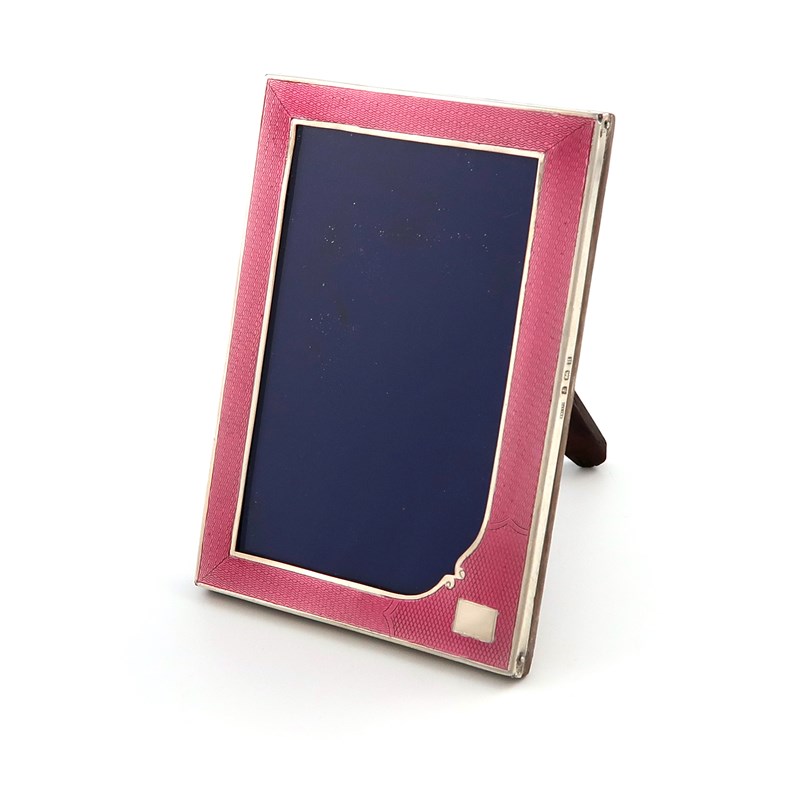 upright rectangular form, the enamel on an engine-turned base, with a rectangular vacant cartouche, wooden easel back, height 13cm.