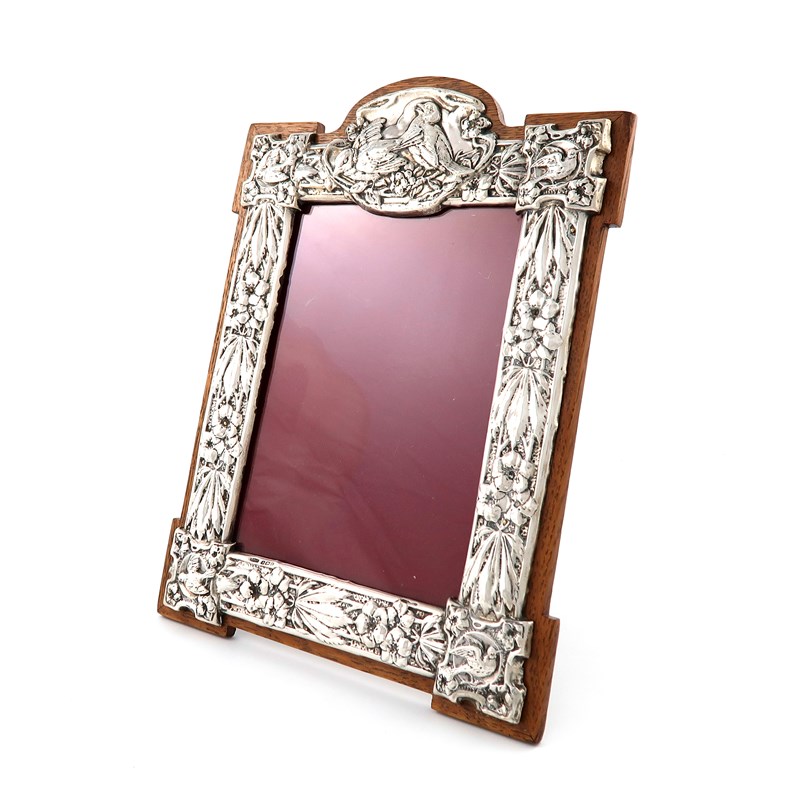 shaped upright rectangular form, embossed with birds and foliate decoration, wooden easel back, height 32cm