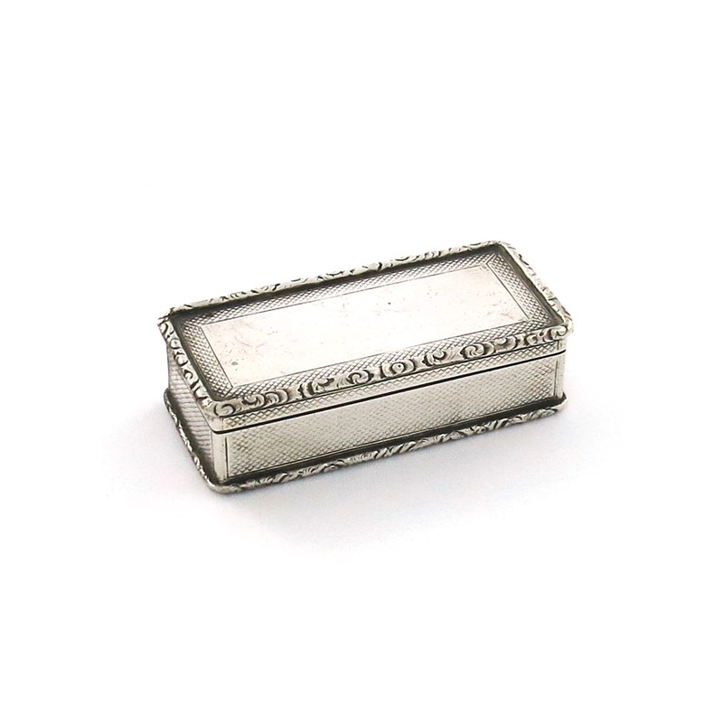 rectangular form, engine-turned decoration, foliate scroll border, the cover erased, length 7.8cm, approx. weight 2.7oz.