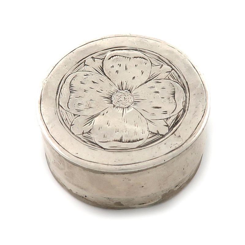 circular form, the pull-off cover engraved with a flower, the base with scratch initials 'E.M', diameter 3.7cm, approx. weight 0.6oz.