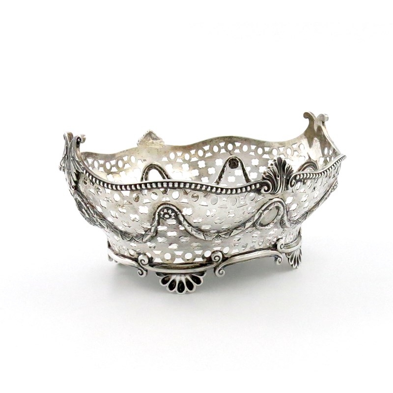 oval form, pierced with mullets and embossed with medallions and swags, on four shell feet, length 18.8cm, approx. weight 11oz.