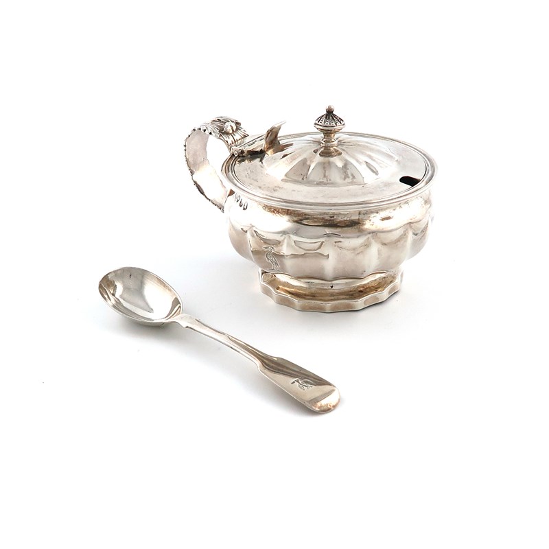 fluted circular bellied form, lead capped scroll handle, the hinged cover with a fluted finial, on a circular foot, engraved with a crest, with a clear glass liner and a later spoon, London 1833, height 7.3cm, approx. weight 5.9oz. (2)
