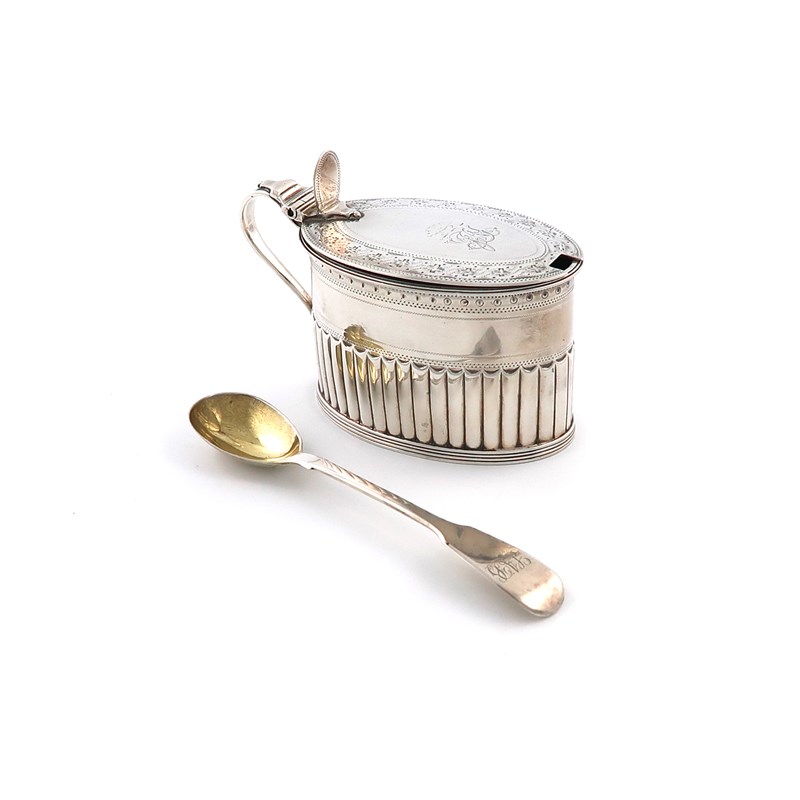 oval form, engraved borders above part-fluted decoration, reeded scroll handle, the hinged cover with a plain thumb-piece and engraved with a crest, with a blue glass liner and a later spoon, London 1814, length 10.5cm, approx. weight 2oz. (2)