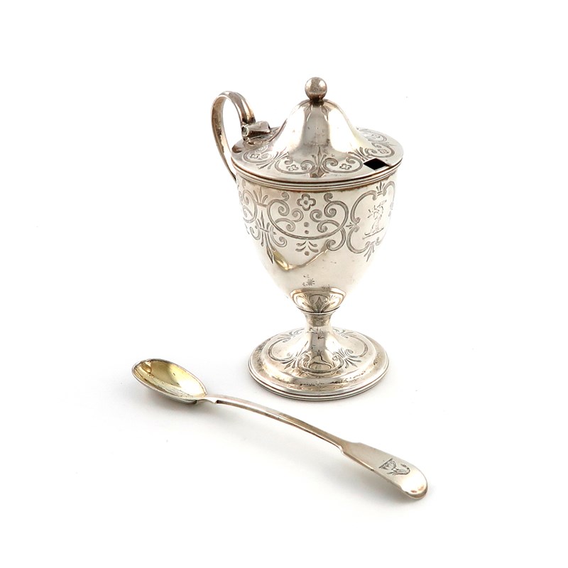 vase form, engraved scroll decoration, scroll handle, hinged cover with a ball finial, on a circular foot, engraved with a crest, gilded interior, and with a later spoon, London 1832, height 12.3cm, approx. weight 5.4oz. (2)