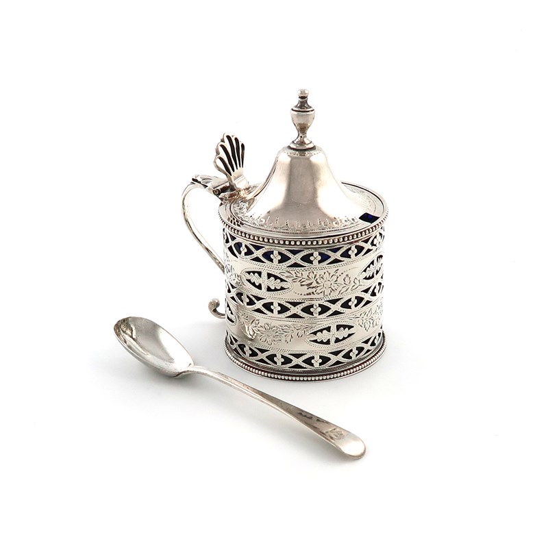 circular form, pierced and engraved foliate and banded scroll decoration, scroll handle, domed hinged cover with an urn finial, beaded borders, on a circular foot, with a blue glass liner and a later spoon, London 1825, height 7cm, approx. weight 4oz. (2)