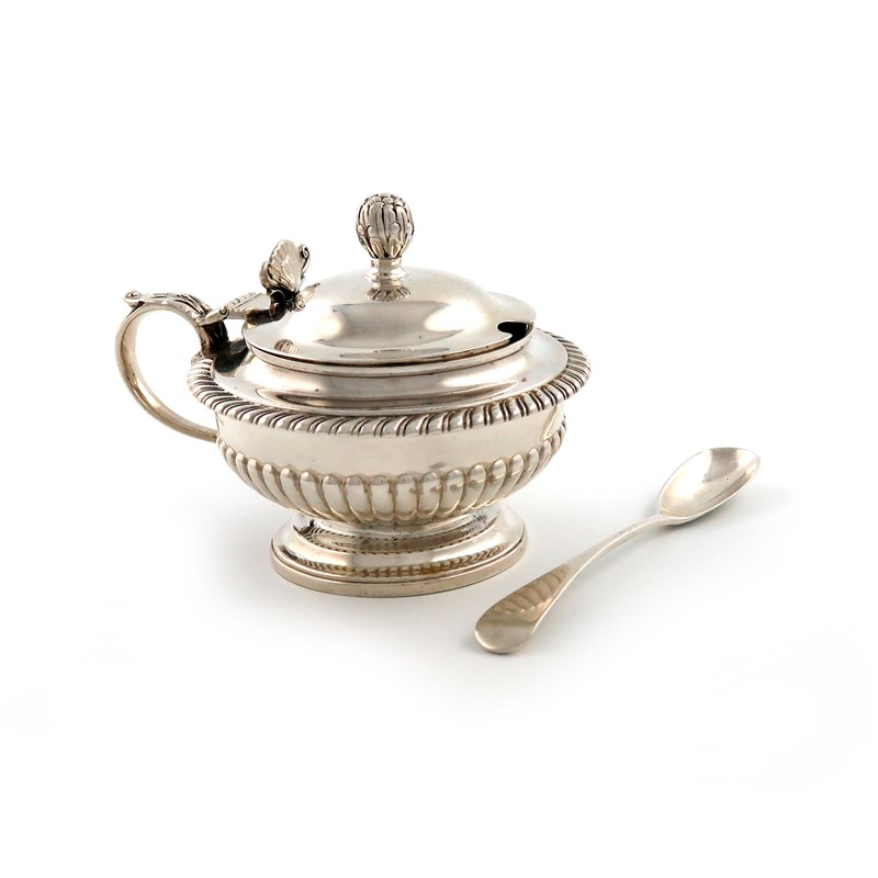 circular bellied form, leaf capped scroll handle, gadroon border, part-fluted decoration, on a raised circular foot, with a blue glass liner and a spoon, approx. weight 7oz. (2)150-200