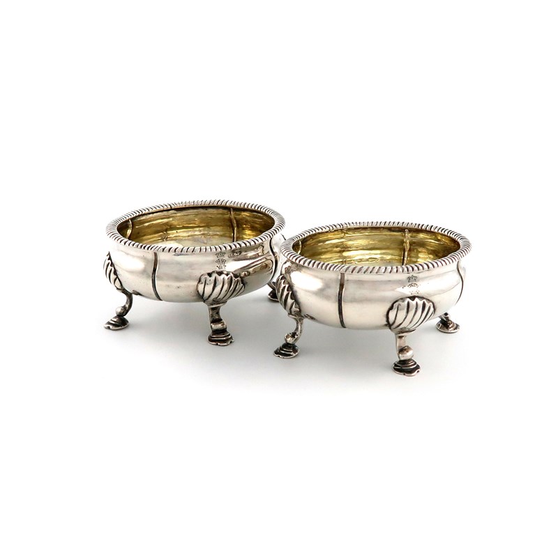 oval bellied form, rope-work borders, gilded bowls, on four shell capped hoof feet, engraved with a crest, length 9.5cm, approx. weight 10oz. (2)