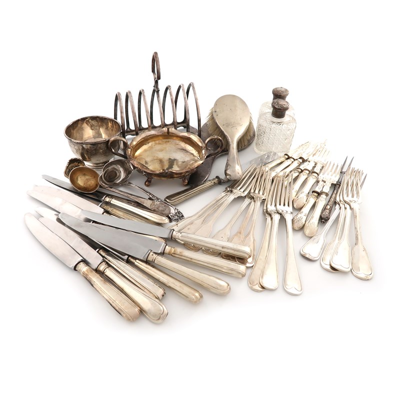 comprising: six matched Italian Fiddle and Thread pattern table forks, plus three further table forks, and ten various table knives, plus a pair of silver-mounted glass scent bottles, London 1913, a hand mirror, a hairbrush, a circular bowl, a continental silver-gilt two-handled bowl, a windmill letter knife, three ladles and electroplated items: a toast rack, and various flatware, approx. weighable 30oz. (qty)