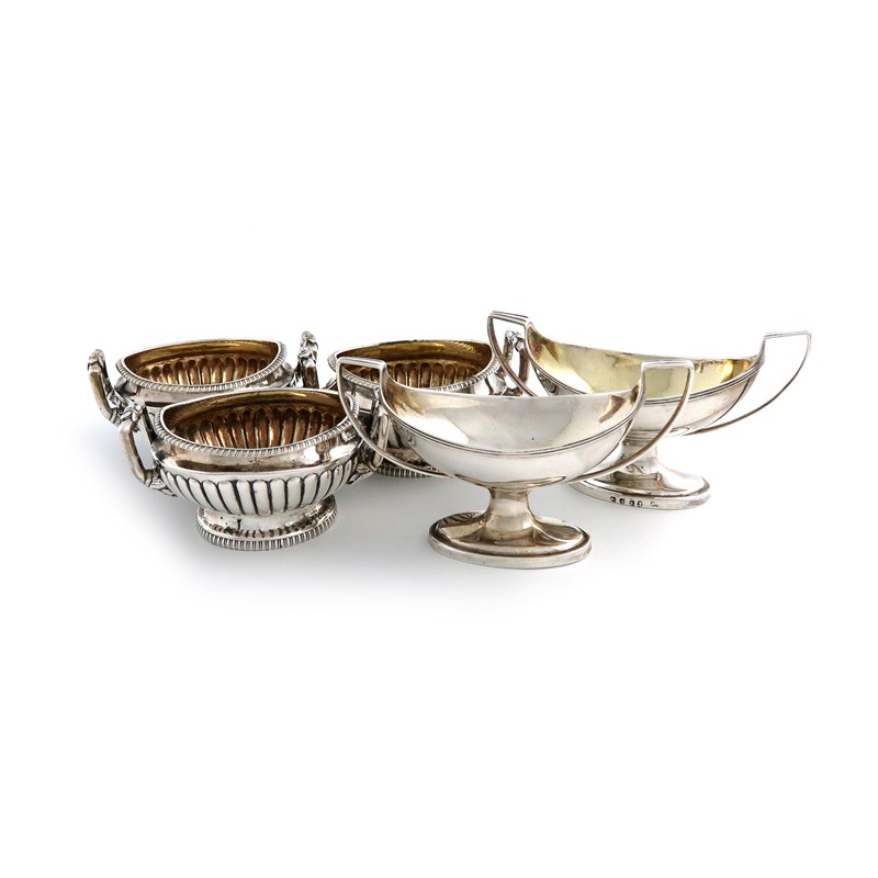 circular form, part-fluted decoration, angular side handles, on circular bases, engraved with a crest, length handle to handle 10.5cm, plus a pair of George III salt cellars of oval form, scroll handles, by Solomon Hougham, London 1805, approx. total weight 18.5oz. (5)