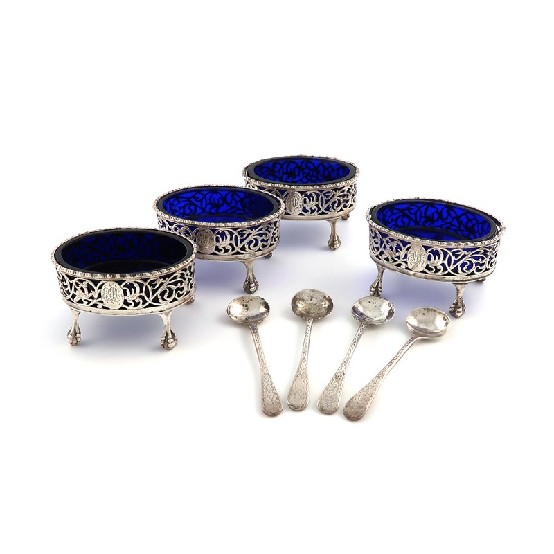 oval form, pierced with foliate scroll decoration, gadroon border, on four claw and ball feet, initialled, length 8.2cm, plus four salt spoons, approx. weight 8.5oz. (8)