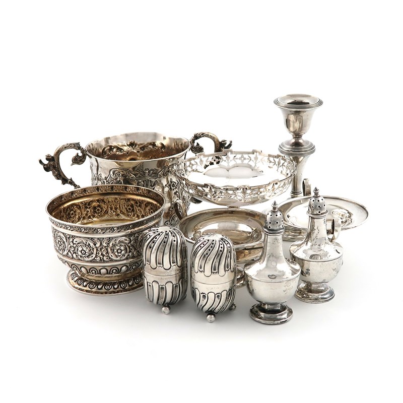 comprising: a late-Victorian two-handled porringer, by Gibson and Langman, London 1898, embossed with a musician and foliate decoration, plus an embossed foliate bowl, a pair of pepper pots, filled bases, a small pair of tazza, a dish with a pierced border, a candlestick and a pair of pepper pots, approx. weighable 16.5oz. (10)