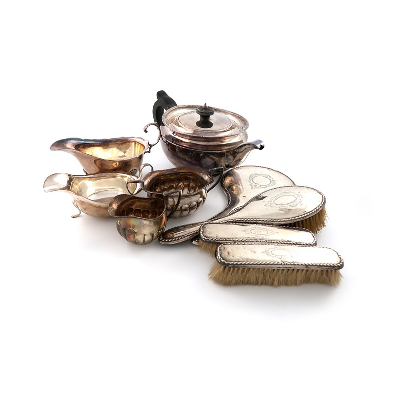 comprising: a George III teapot, probably by Charles Hollinshed, London 1809, circular bellied form, scroll handle, gadroon border, length handle to spout 26.5cm, plus a cream jug and sugar bowl, two sauce boats and a four-piece dressing table set, approx. weighable 36.5oz. (qty)