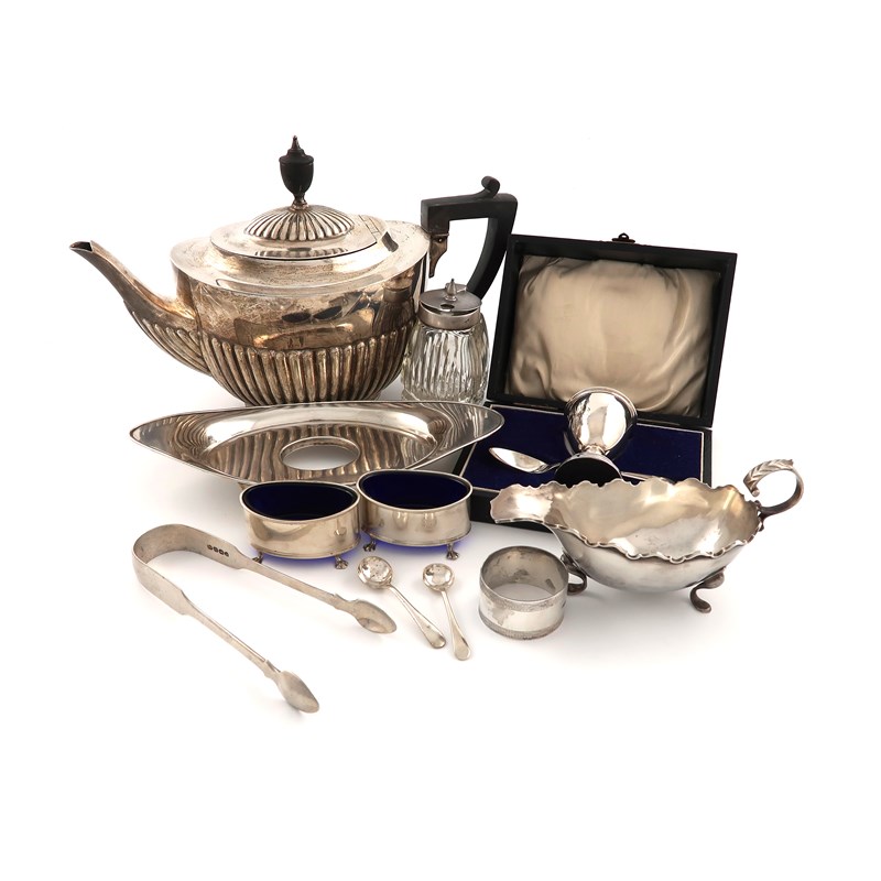 comprising: a presentation teapot, by William Hutton and Sons, Sheffield 1916, oval fluted form, inscribed, plus a sauce boat, an inkwell stand, a pair of salt cellars, two salt spoons a pair of tongs, a cased egg cup and spoon, a napkin ring and a silver-mounted glass condiment jar, approx. weighable 27.5oz. (qty)