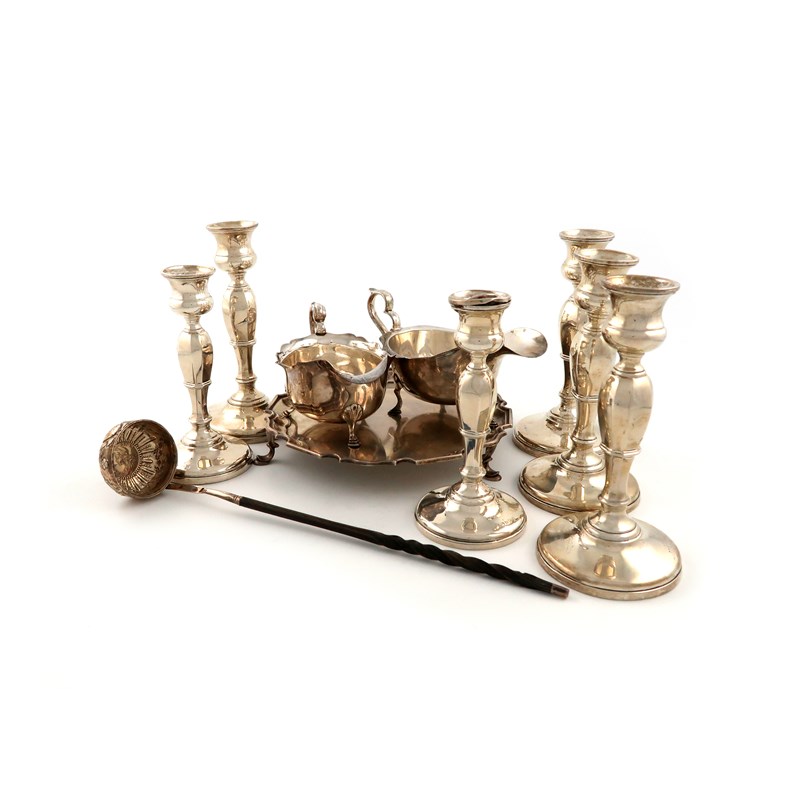 comprising: a set of four candlesticks with a pair en suite, by Mappin and Webb, Birmingham 1929, the bases inscribed, plus a waiter, Sheffield 1928, two oval sauce boats, and a toddy ladle, the bowl set with a coin and with a twisted whale bone handle, approx. weight 21oz. (10)