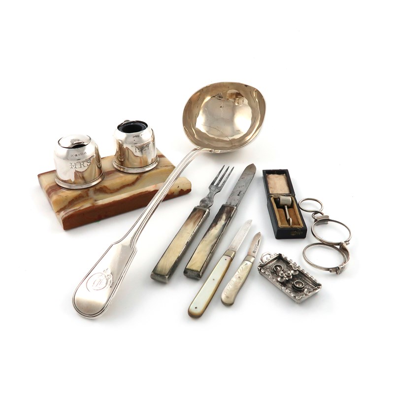 comprising silver items: a George IV Fiddle and Thread pattern soup ladle, by George Piercy, London 1821, initialled, a double inkwell, Birmingham 1919, on a hardstone base, a miniature tea set on tray, with import marks for London 1891, two fruit knives, plus a steel travelling knife and fork, with horn handles, a pair of lorgnettes and Henry West magnifying glass for photograph slides, approx. weighable 8oz. (8)