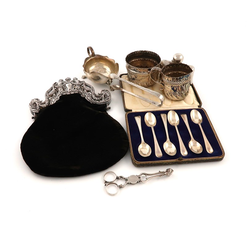 comprising: a continental bag mount, with import marks for Sheffield 1900, importer's mark of Samuel Landeck, pierced with figural and foliate decoration, plus a cream jug and sugar bowl, a small sauce boat, a hip flask, a pair of sugar tongs, a pair of sugar nips, and a cased set of six teaspoons, approx. weight 19oz. (qty)