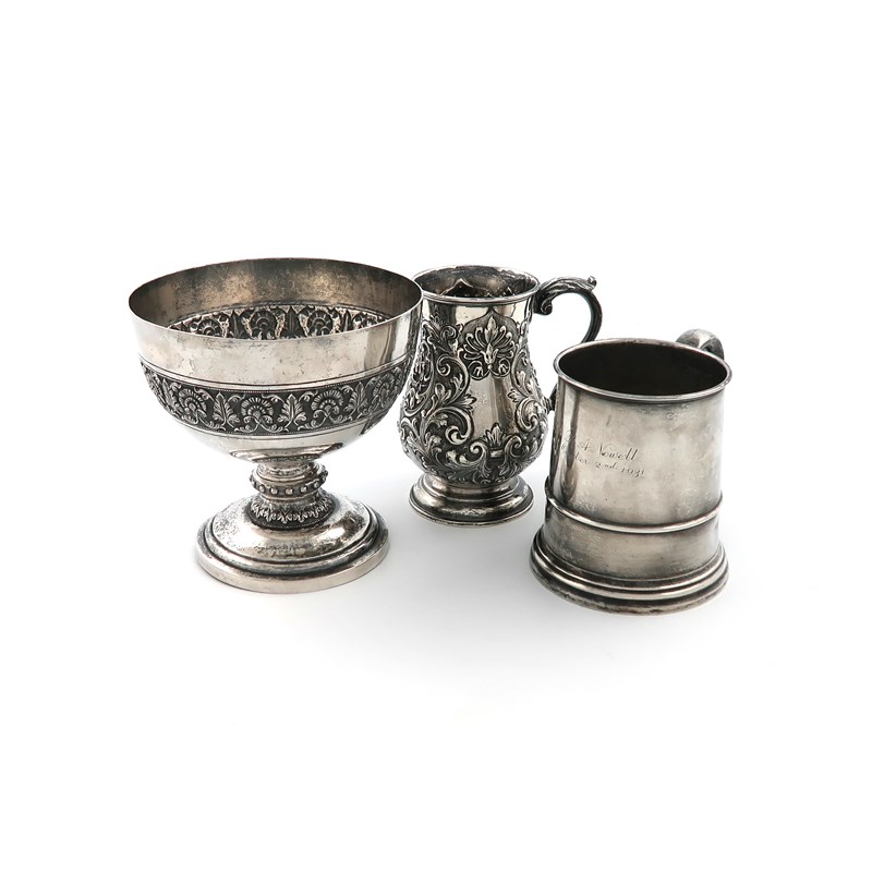 comprising: an Edwardian mug, by Walker and Hall, Sheffield 1902, chased foliate decoration on a matted background, leaf capped scroll handle, initialled, height 11.2cm, plus a silver mug, by William Hutton and Sons, Birmingham 1931, tapering circular form, inscribed, and an unmarked Indian bowl of circular form, chased foliate girdle, on a raised circular foot, approx. total weight 24oz. (3)