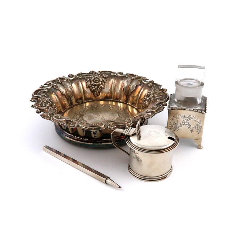 comprising: an early-Victorian mustard pot, by Charles Fox, London 1837, circular form, reeded borders, the hinged cover with a crest, with a blue glass liner, plus a silver-mounted glass bath salts bottle, of rectangular form, engraved decoration, on four bracket feet, London 1912, an Asprey extending three-section pencil ruler, Birmingham 1923, the three sections open to make twelve inches, and an electroplated wine coaster, approx. weighable 5oz. (4)