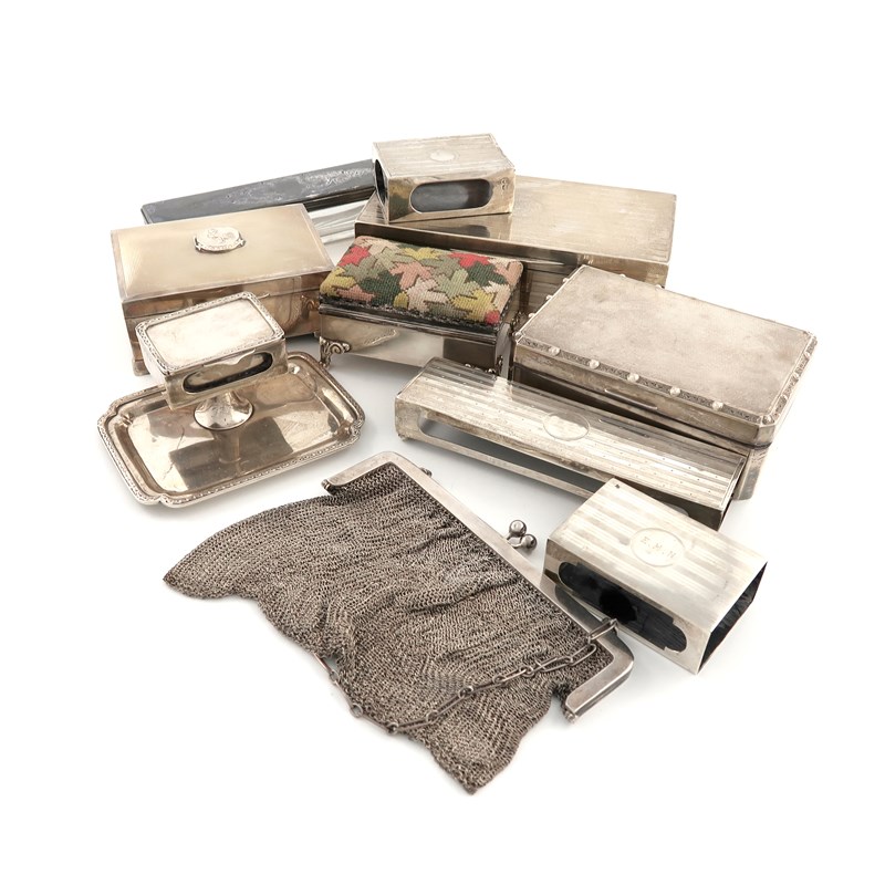 comprising: a table match box, of rectangular form, on a raised stand, plus three matchbox covers, a dressing table box, London 1913, rectangular form, the hinged cover with embroidered decoration, a silver-mounted glass dressing table box, three cigarette boxes and a mesh bag, approx. weighable 25oz. (qty)