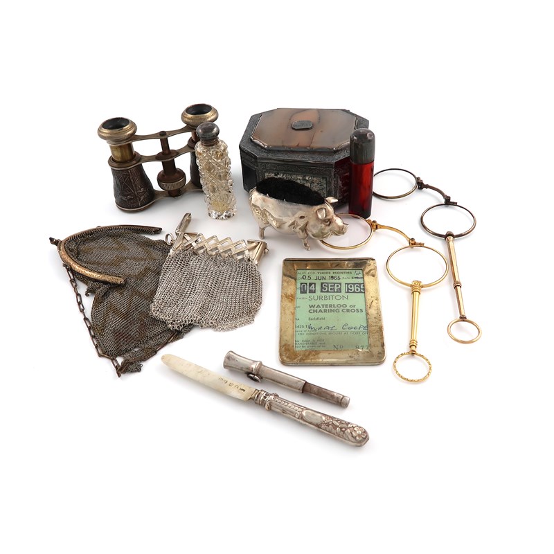 comprising silver items: an Edwardian novelty silver pen wipe, by H. Matthews, Birmingham 1902, modelled as a standing pig, length 7.5cm, plus two silver-mounted scent bottles, a small knife, a cigarette holder, a French mesh purse, a metalware mounted agate box, rectangular form, the mounts with chased decoration, set with vari-coloured agate panels, plus other items including two gilt metal lorgnettes, a mesh purse, (a.f), a pair of opera glasses and an electroplated ticket holder. (qty)