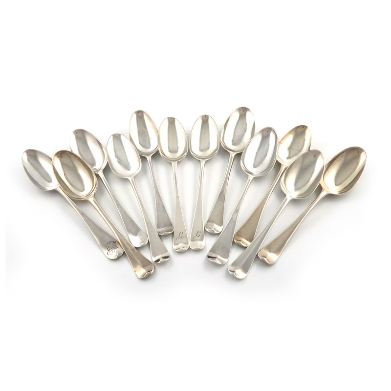A collection of twelve 18th century silver Hanoverian pattern tablespoons