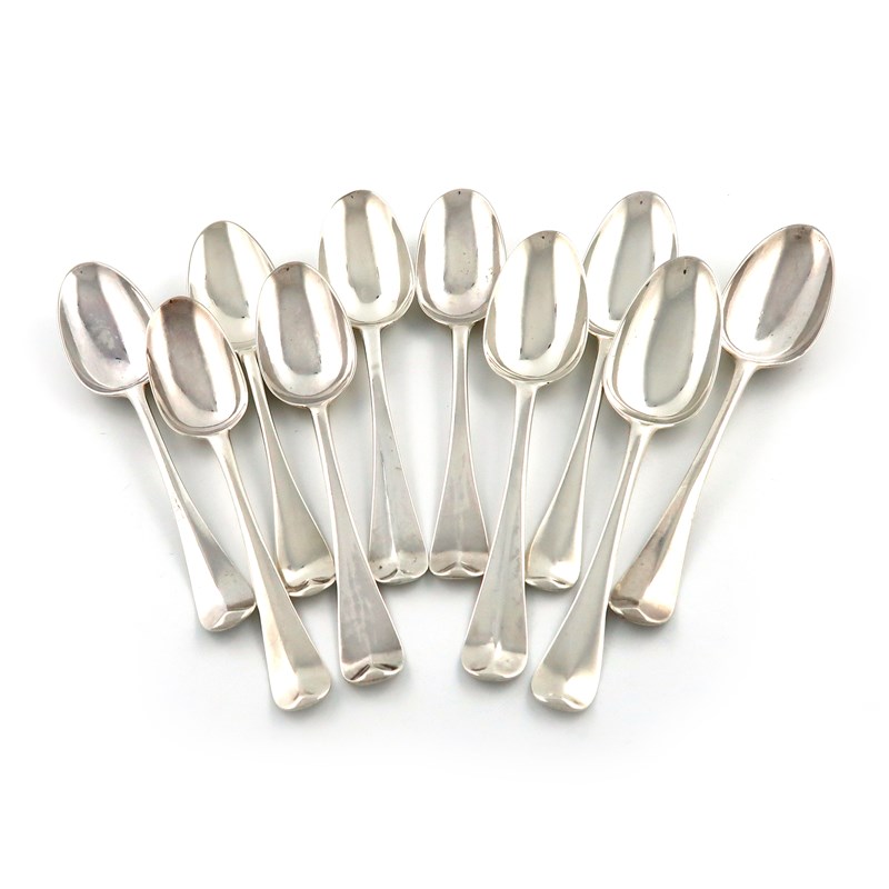 A collection of ten George II silver Hanoverian pattern tablespoons