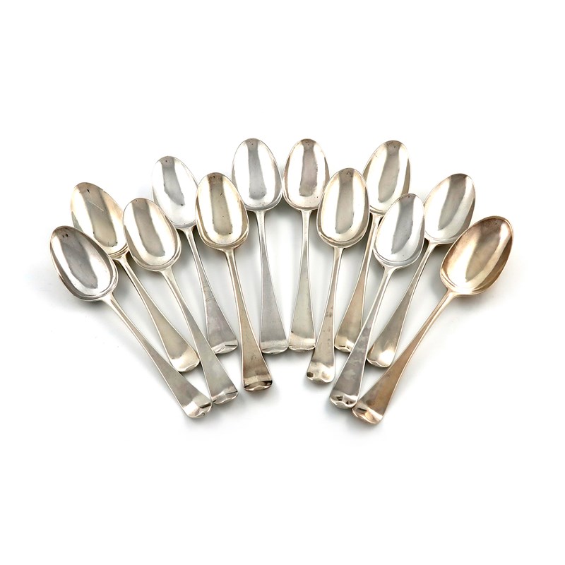 A collection of twelve George II / III silver Hanoverian pattern tablespoons,