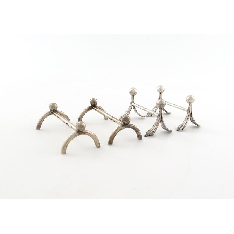 with ball finials, length 7.8cm, plus a pair of silver knife rests, by J.E. Bushell, Birmingham 1932, plain form on arched supports with ball finials, length 9.3cm, approx. weight 5oz. (4)