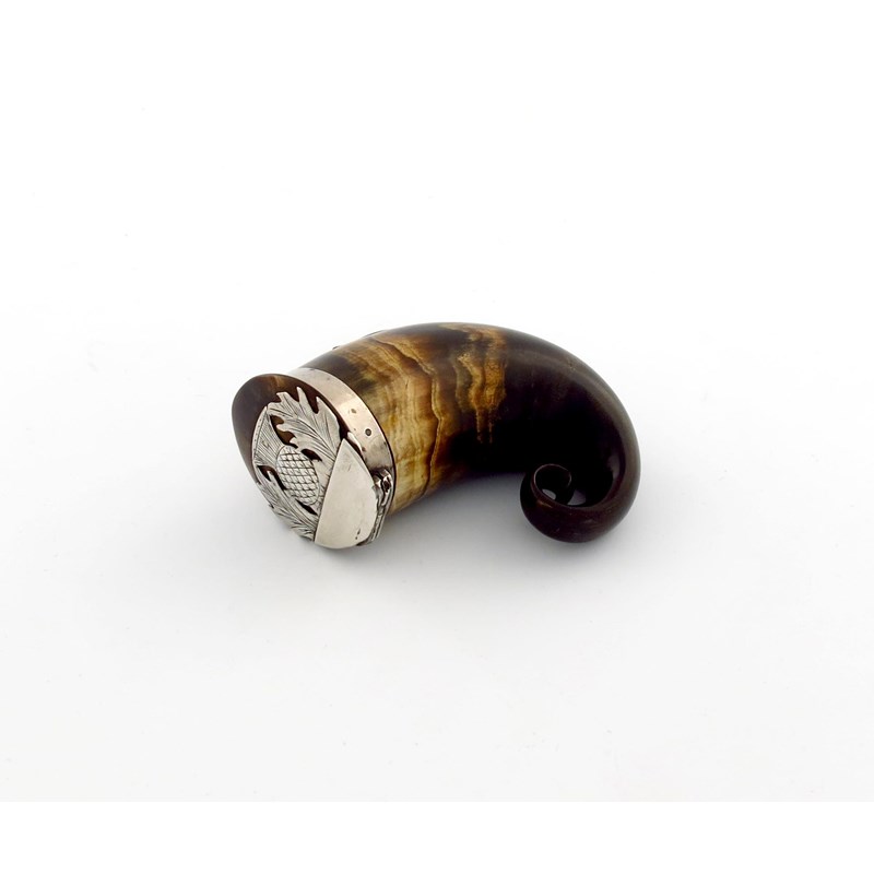 conventional form, the hinged cover with an engraved thistle motif, the front applied with a monogrammed shield, length 9.5cm.
