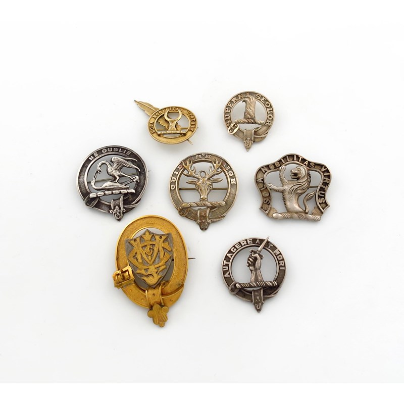 A collection of seven clan badges,